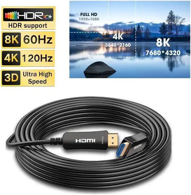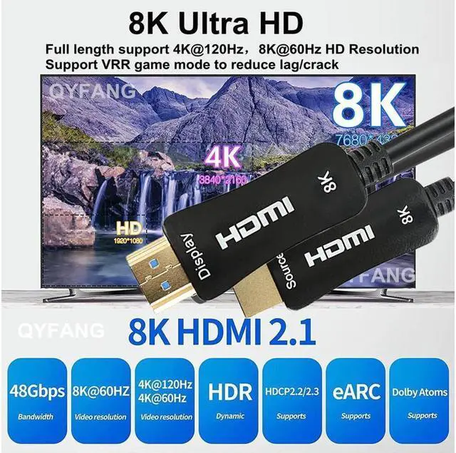 The 8K fiber optic HDMI cable support long distance at 8K@60Hz, 4K@60Hz/120Hz/144Hz & up to 10K resolution. No signal loss. Compatible with Dolby Atmos, Dolby Vision, HDCP 2.2 & 2.3, DTS: X, Dynamic HDR, BT. 2020, eARC, ALLM, QFT, QMS, VRR. Backward compatible with earlier versions of HDMI. If you need higher refresh rate (like, 4K@120Hz/144Hz) please make sure your device support it. please make sure your device (player, video, tv, etc) support 8K.