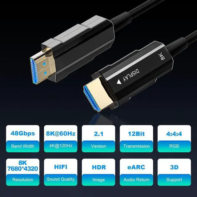 8K Fiber HDMI 2.1 Cable - 50-Foot HDMI Cable supporting high-speed 48Gbps, 8K@60Hz, 4K@120Hz, 2K@240Hz, Dynamic HDR, Dolby Vision, eARC, HDCP 2.2 and 2.3, 3D, 32 Audio Channels, 4:4:4 RGB, ALLM, Quantum Field, QMS, VRR, DSC, etc. Backward compatible with versions 2.0 / 1.4 / 1.2 / 1.1.