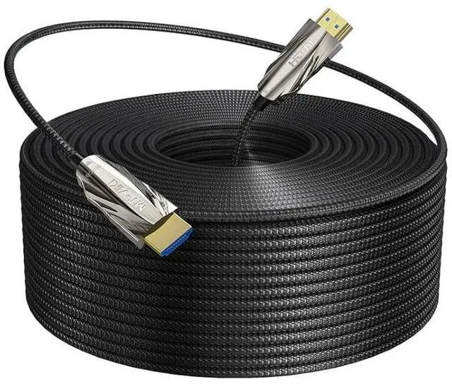 This an industrial 8K HDMI fiber optical cable 100ft, nylon braided, not plastic, supports 8K 60Hz or 4K 120Hz or lower version.