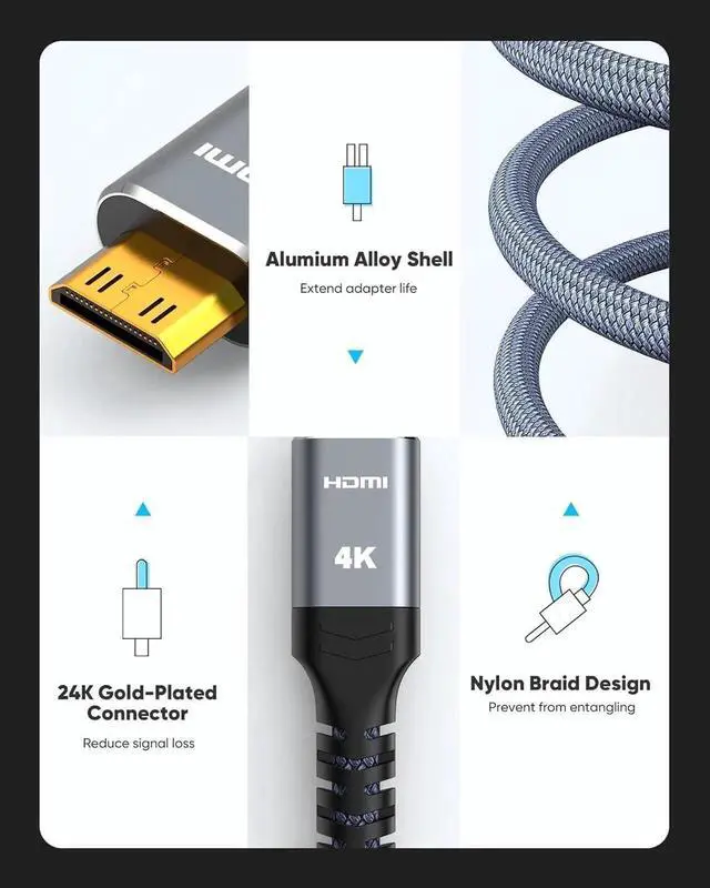 High Speed without Delay: This mini HDMI to HDMI adapter cable supports up to 4K 60Hz as well as 4096x2160, 3840x2160, 2560x1600, 2560x1440, 1920x1200, and 1080p; Please mind that 4K video requires a 4K equipped source, cable, and output display