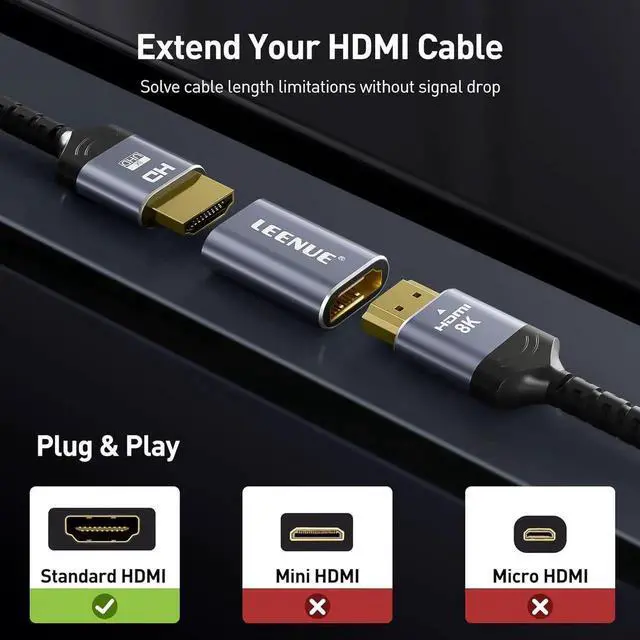 HDMI CABLES: Connect two HDMI cables for long-distance 8K expansion with the hdmi to hdmi adapter. Perfect for home theater gaming and office presentations.
