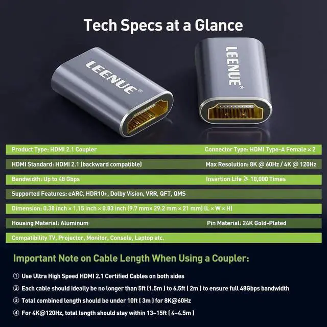 HDMI 2.1 PERFORMANCE: The aluminum hdmi female to female adapter fully supports 8K@60Hz 4K@120Hz Dolby Atmos Dolby Vision HDR eARC HDCP 2.3 VRR QFT QMS and 3D. Enjoy stunning smooth and ultra-HD visuals and immersive audio/video feast syncSEAMLESSLY EXTEND