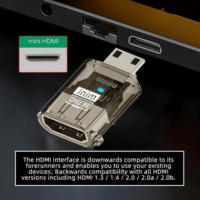 • Mini-HDMI Type-C Male to HDMI 2.1 Female UHD Extension Adapter Extender Transparent with Smart LED Light Support 8K 60hz HDTV