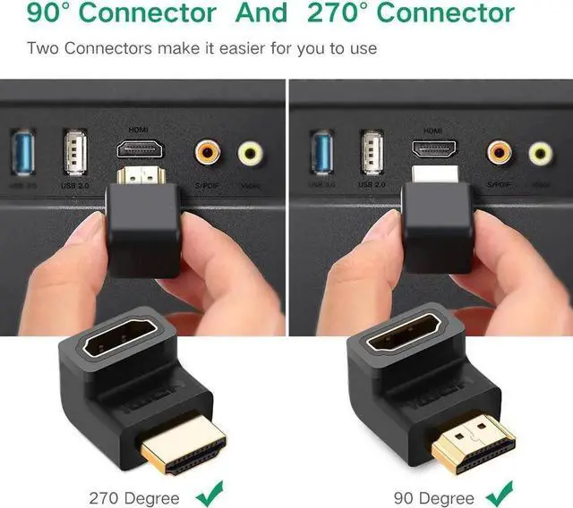 FIND THE RIGHT ANGLE with a 90 degree and 270 degree HDMI adapters; Direct the cable up or down depending on the orientation of the HDMI port on your equipment; The right angle hdmi adapter extends less than 1 inch from the HDMI port to connect a wall mount TV