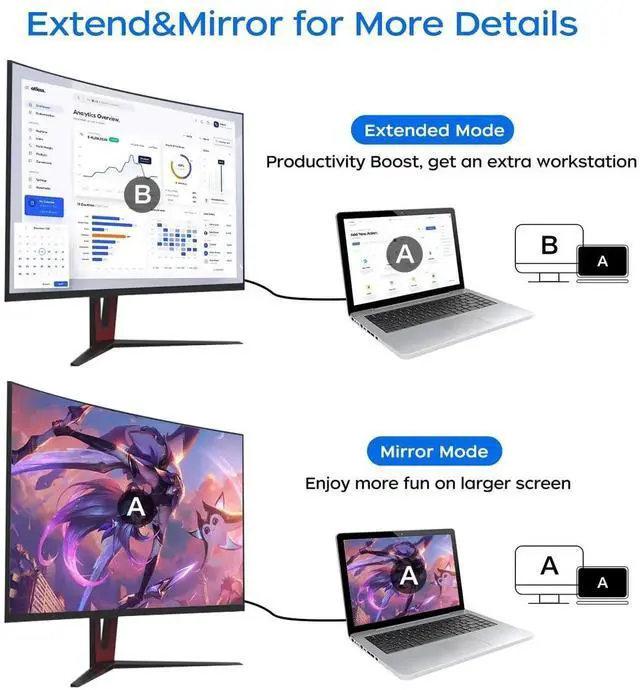 Extended Mode: Extend your desktop to a second monitor to get an expanded workstation, work with multiple documents or web pages at the same time.
