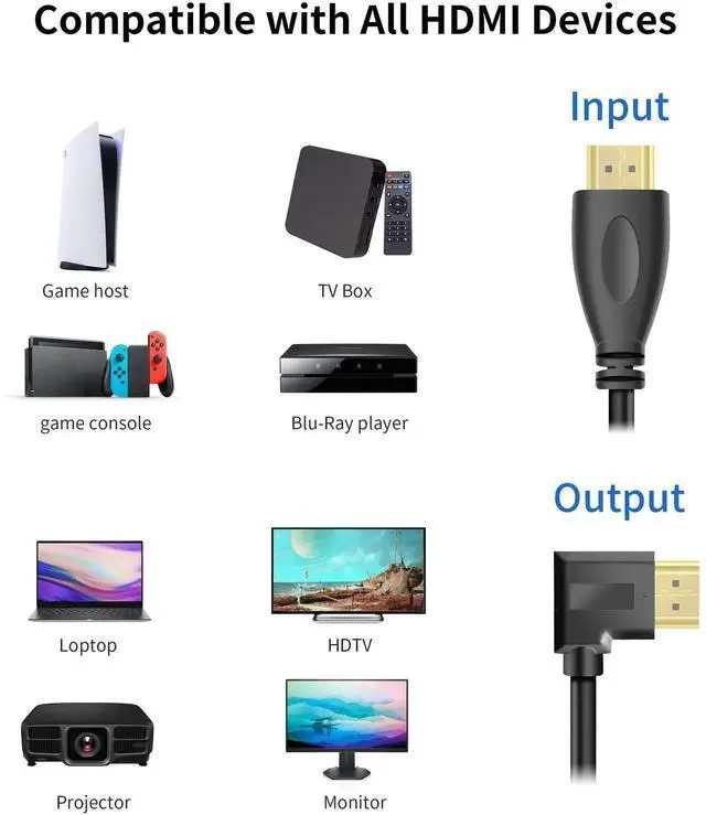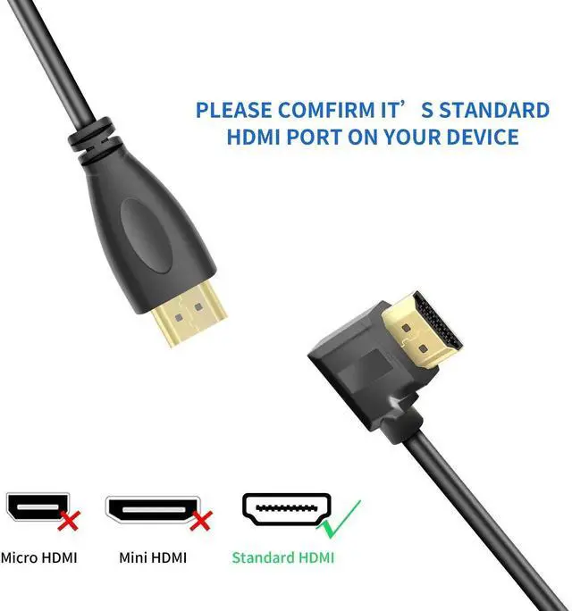 90 Degree HDMI Cable Made for HDMI Ports in Tight Spaces, 90-Degree Angle Male Plug for Hard to Reach HDMI Female Ports in the device.Mainly used in plasma TV, LCD TV, projection TV, projector, DVD player, projector, D-VHS record, digital camera, projector and digital video and audio display equipment video and audio signal transmission.
