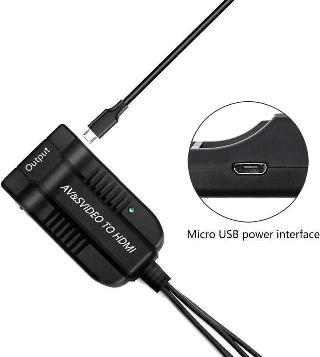 Support HDMI 1080p or 720p output. No need to install drivers, support PAL, NTSC3, 58, NTSC4, 43, SECAM, PAL/M, PAL/N standard TV formats input. Please hook up the Micro power cable (included) to 5V power source before use. It has Male Rca?? (Yellow, White, Red)?? Input port and svideo Input port, hdmi output portIt is Male AV to HDMI Converter