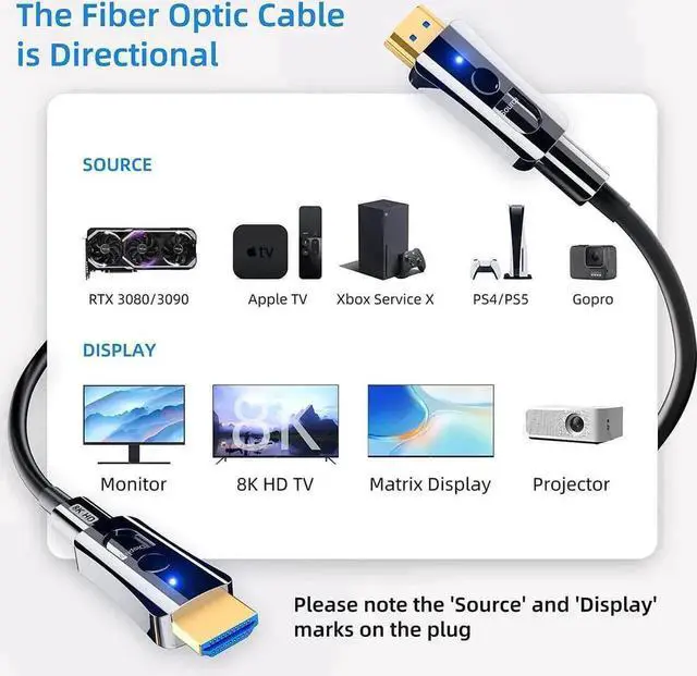 Smart Chip: Fiber Optic Hdmi 2.1 Cable principle is to collect the input electrical signal through the connection of the chip processing into optical signals for transmission and then through the chip processing into electrical signals for output, note: optical cable is a one-way transmission, from the "source" to "display ", please check the direction before use.