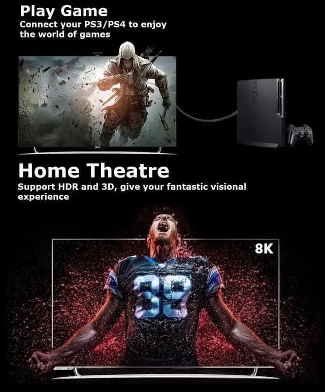 Universal Compatibility,HDMI Copper Cable enable to connct from your HDMI Source Device to your 4K or 8K HDMI Display,Enjoy the Ultra High Definition Ultimate Experience of the Big screen,fit for PC Laptop,PS4,Blu-Ray Player,Fire TV etc as Source,HDMI HDTVs ,Monitors ,Projectors as Display,Plug and Play