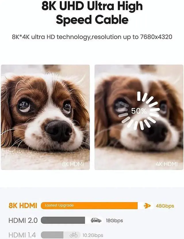 With dynamic HDR technology, you will experience a wider color gamut, brighter picture, more obvious brightness and more delicate picture contrast from this 8K HDMI Cable