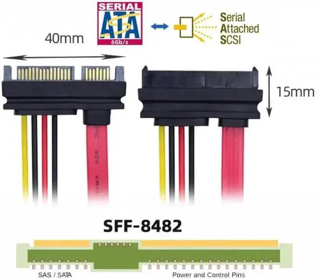 This SAS cable to 1x SATA22pin with 10 cm length, enables you to connect a SAS HDD with SFF 8482 port to a SAS compatible SATA controller (hybrid controller).