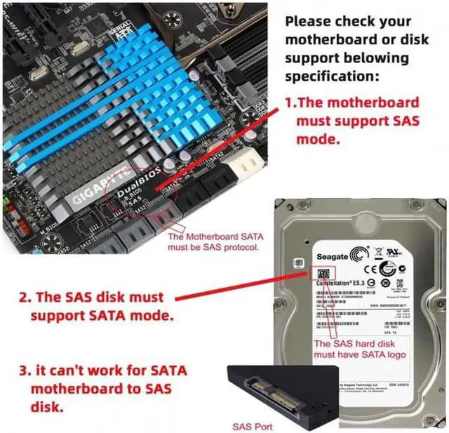 4. It can't connect the SATA hard disk to normal SAS motherboard. (it will be worked if your hard disk has the SAS chipsit, Otherwise can't work.)