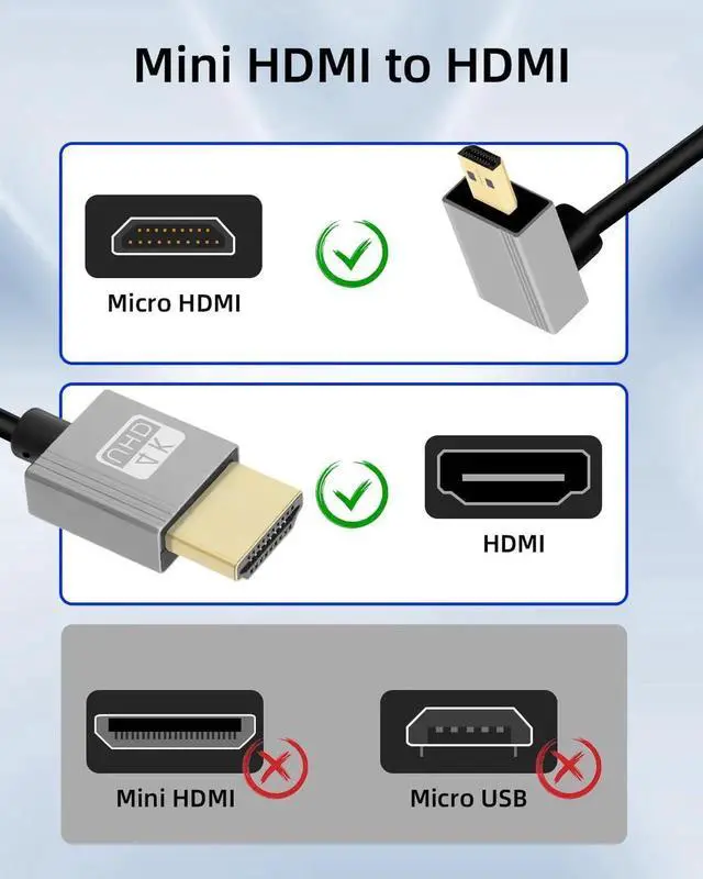 5.Supporting 4K resolution and backward compatible with 2K, 1440p, 1080p, 1080i, 720p, 480p and 480i, the Micro HDMI cable delivers stunning visuals without any loss in quality. Whether you're presenting at a conference, sharing photos with friends, or watching your favorite movies on a bigger screen, our HDMI to Micro HDMI has you covered.