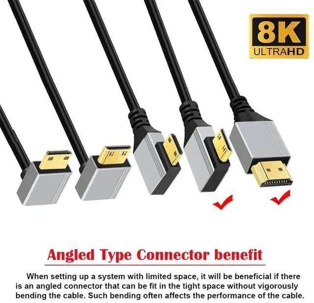 Right Angled Connector Design: 90 Degree Angled HDMI, The angled type Allowing you to connect it to a female port, even if space around the port is limited.