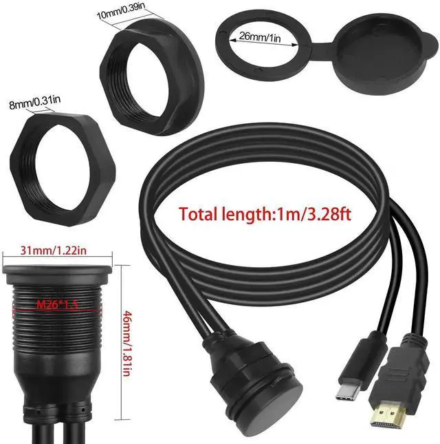 USB C and HDMI Threaded fixing Embedded Panel Mount 2 in 1 waterproof cable. The 2 cables are independent and do not interfere with each other, allowing simultaneous connection of devices using USB C-type ports and HDMI ports. Comes with M26×1.5 thread and double nuts, just punch a 27mm hole on the surface of the veneer and fix it with nuts for USB C port expansion and extension. Double nuts prevent loosening. Used to extend USB C and HDMI ports of dashboards and electronic devices in cars, trucks, boats, yachts, etc. It can also be installed in your den, bedroom, office, easy to connect USB C and HDMI ports to computer, projector, TV, monitor.
