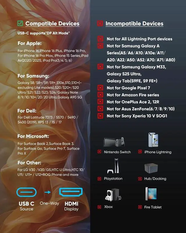 This product is only compatible with devices that support the DP Alt Mode on their USB C ports. Devices that do not support DP Alt Mode cannot use this cable. Scroll down to the ''Compatibility List'' module to check if this cable fits for your device or not.