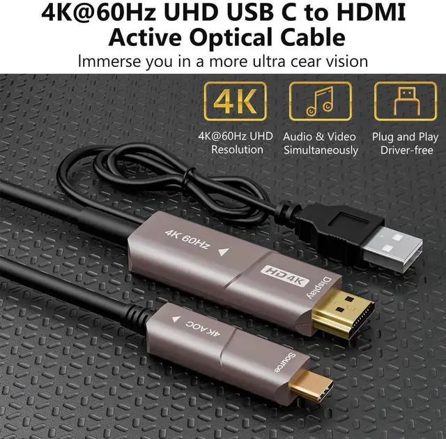 USB C to HDMI Optical Cable Components This USB Type-C to HDMI (M/M) optical cable securely connects USB-C or Thunderbolt 3 port to your MacBook, Windows laptop or other compatible device to an HDTV, monitor, or projector with HDMI input. Supports USB-C Display Switching Mode to Convert Audio/Video Signals: By connecting the USB-C end to a source device that supports USB DisplayPort Alt Mode, you can output 4K video and digital audio to an HDMI monitor, TV, or projector without installing special software drivers. Because the cable uses optical fiber, it can transmit audio/video signals over long distances without latency or loss. It is also insensitive to EMI/RFI line noise that can interfere with your audio/video signal and disrupt the performance of your connected equipment. This cable supports Ultra HD resolutions up to 3840 x 2160 (4K x 2K) at 60Hz, (does not support HDR), delivering a wide range of vibrant colors with rich contrast, brighter whites and deep blacks that cling to your 4K display. HDCP 2.2 compliance (HDCP 1.4 compatible mirrors) and 4:2:2 chroma downsampling allow you to stream 4K Amazon and Netflix content without hassle. The upgraded fiber cable is easier to install than the housing: because the fiber cable is thinner and more flexible than standard copper cables, it is easier to install in corners and hard spaces within reach. PREMIUM CONSTRUCTION FOR SUPERIOR PERFORMANCE: High quality materials ensure exceptional performance throughout the life of the cable. Note: The cable must be installed in the right direction to work properly, so please check the source and display labels on the connectors before installation.