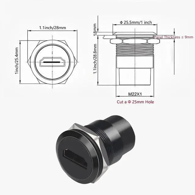 [Secure Screw Fixing]: This black HDMI plate adapter features a threaded installation with an M22×1.5 nut. Easily install by cutting a 23mm hole in the dashboard or equipment panel, securing with the nut for a stable HDMI display port extension.