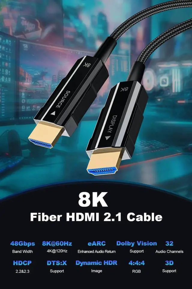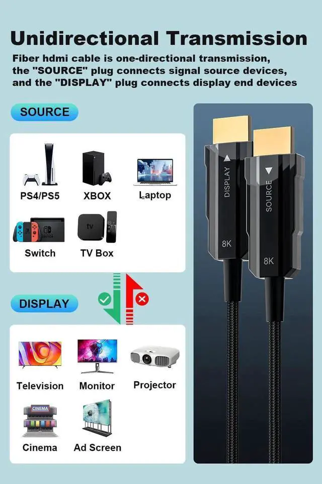We are a company mainly selling Fiber Active Optic Cables:HDMl, Display, Type C ,USB A, and connectors such as HDMIto Display,type C to HDMl/DP. Our products have world classtechnology support, they are stable and reliable after thousands oflaboratory tests and years of market testing. Our products havebeen sold worldwide: the United State, the Europe, Asia, China. We believe fiber is the future and we are to promote the progressworldwide, we hope that everyone of you could enjoy the technologyof Fiber Cable: Higher Resolution, Wider Bandwidth, LongerDistance, Less Signal Loss, Fewer Interference, Lighter andThinner. Packing list: Fiber Active Optic HDMI 2.1 Cable *1 User Manual *1