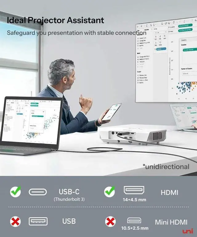 USB-C to 4K HDMI CableUse the uni Type-C to HDMI Cable with your USB-C device to view sporting events, movies, video games, and photos/albums directly on your HDMI-equipped monitor/display/TV - never again miss the game-winning touchdown or your favorite TV episodes. Direct HDMI cable connection from your smartphone to TV means no more casting issues due to unstable WiFi. This is a unidirectional cable, only support USB C to HDMI. Not USB to HDMI cable or mini HDMI