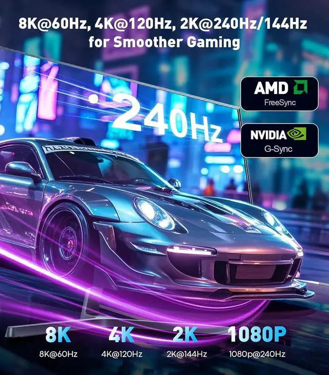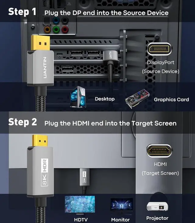 Ultra HD Resolution Support: This DisplayPort 1.4 to HDMI 2.1 cable supports 8K@60Hz extreme picture quality output and is backward compatible with 4K@120Hz/60Hz, 2K@240Hz/144Hz/120Hz/60Hz and other high-brush resolutions, which meets the needs of professional gaming, 8K video editing and UHD film and TV. Lossless transmission is achieved through the synergy of DP 1.4 ' s HBR3 bandwidth ( 32.4G bps) and HDMI 2.1.