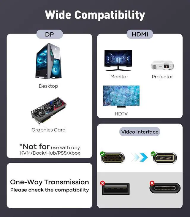 Device Compatibility: Please note - Display Port to HDMI Cable is not compatible with PS5/Xbox/NS/ and laptops with HDMI port. One-way transmission design (DPHDMI) supports connecting PCs and graphics cards equipped with DP/DP++/DisplayPort ports to HDMI TVs/monitors/projectors. Plug and play without driver