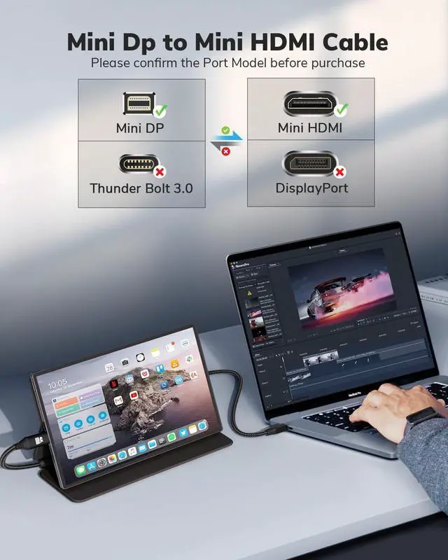 Universal CompatibilitySupports devices with Mini DisplayPort (Desktop computer, laptop computer). Surface Pro Lineup, Surface Laptop, and any other laptops with a Mini DisplayPort Output (NOT HDMI) Compatible with convenient displays with Mini HDMI ( for KYY, ARZOPA, VILVA, MNN, etc. portable monitors).