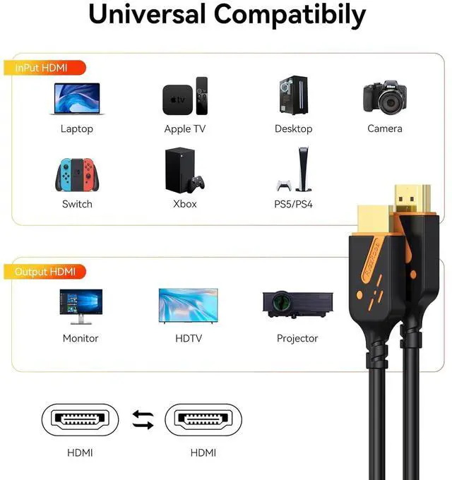 Compatible HDMI DeviceThe HDMI 2.0 cord support various electronic devices, including HDTV, PC, gaming consoles like PS5/4/3 and Xbox One, Blu-ray players, A/V receivers, streaming media players such as Roku and Fire TV. They are also compatible with projectors, monitors, and digital cameras that have HDMI output. Additionally, these cables can connect soundbars and other audio equipment to high-definition video and audio sources