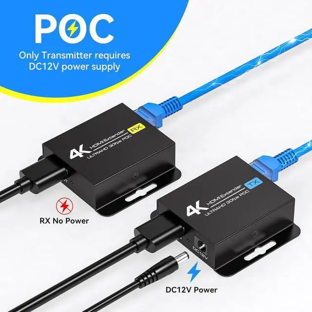 POC Technology: Single Side ChargingThe hdmi to cat6 hdmi extender uses POC technology. Simply connect the transmitter (TX side) to the power adapter to support the entire kit. No driver or software installation is required. This avoids the problem of desktop clutter caused by too many cables and reduces many complicated steps, making it simpler and more convenient