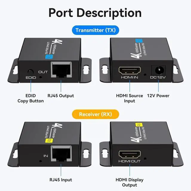 4K HDMI ExtenderThis hdmi over ethernet uses a single oxygen-free copper CAT6/CAT7 cable to extend HDMI audio and video signals up to 131 feet/40 meters, with a maximum resolution of 4K@30Hz. The audio and video are synchronized with no delay, and the image is stable, clear, and smooth, making it the ideal choice for playing UHD videos.