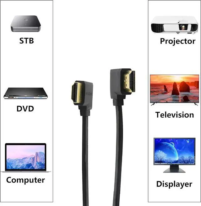 Connector: 90 Angle Right HDMI Male to Left HDMI Male Adapter cable 90 Degree right & Left- angle HDMI cable relief the strain on HDMI ports to increase the lifespan of your device and HDMI cable, gold plated connectors, bare copper conductors, and foil & braid shielding provides superior cable performance, static-free video transmission, and noise suppression.
