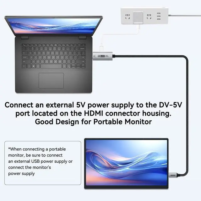 Plug & PlaySimply connect HDMI cord to your source (e. g., PS5), USB-C cord to the display devices, such as monitor. For the portable monitor and AR/XR application scenarios, please ensure external power supply is connected.