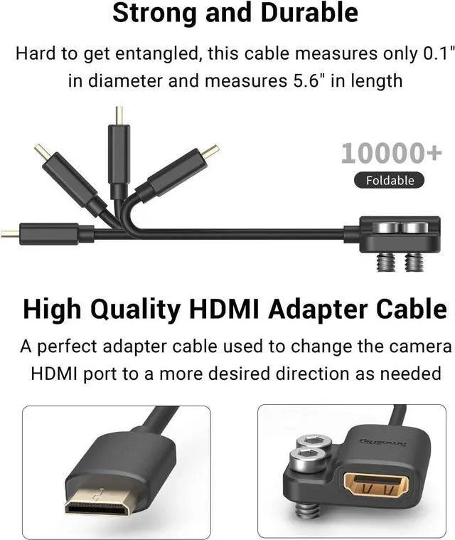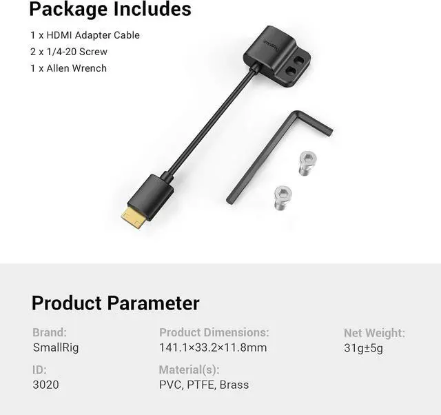 WIDE COMPATIBILITYThis cable adapter 3020 is compatible with cameras with Mini-sized port, like for Nikon Z6, Z7, D780, for Canon EOS RP, 5D Mark IV, etc. Besides, it is for camera cages or L brackets with no less than two 1/4" -20 thread holes (9mm distance from center to center) on the left side, like 2824, 2972, 2833, CCC2332, CCC2271, etc.