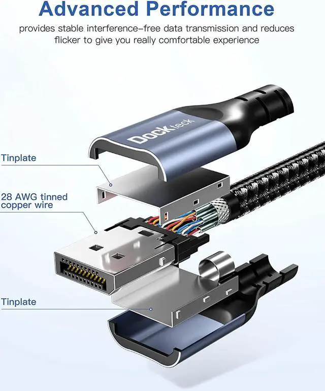 Great Choise for Quality Durability Dockteck Display Port cable 1.4 is made of 32AWG tinned copper with triple shielding to ensure stable signal transmission. Tinplate plated connectors and Aluminum shell has stable heat dissipation while extending product life. The nylon braid design makes the cable more flexible and light to bend, preventing the cable from fraying.