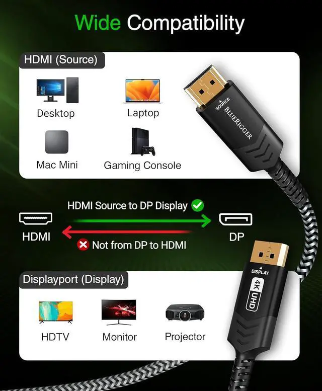 WIDE COMPATIBILITY: BlueRigger HDMI to DP audio video cable is compatible with Desktop, Laptop, PC, Gaming Console (PS5, PS4, PS3, Xbox), Mac Mini for the HDMI, and TV, Projector and Monitor for the display port