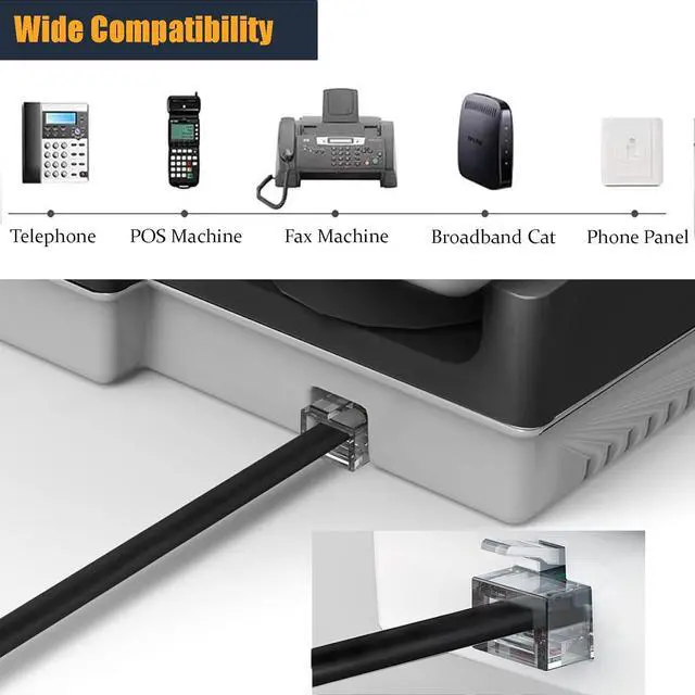 Standard RJ11 6P4C phone connectors on both ends, plug and play ready for fax lines, modems, cordless or standard phones