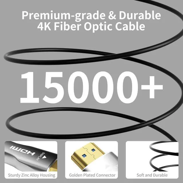 Premium Construction for Durability: Our fiber optic HDMI cable features 24K gold-plated plugs for enhanced durability and resistance to oxidation. The high-quality metal shell design improves heat dissipation, while the lightweight PVC material allows flexible bending of the HDMI cord angle for long-term durability. The HDMI cables enable uncompressed and lossless signal transmission over long distances thanks to the natural resistance of optical fiber to electromagnetic interference