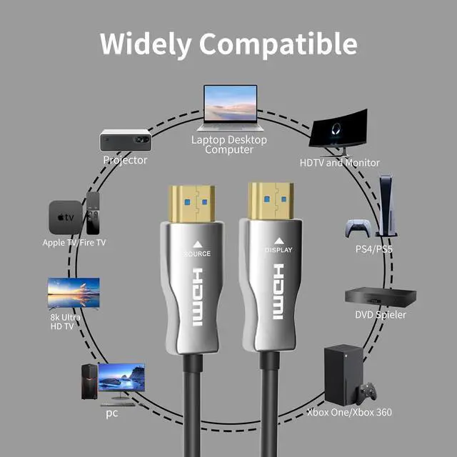 Suitable for Various Devices: Fiber optic HDMI cable is HDMI to HDMI interface and is compatible with all HDMI devices. Such as Apple TV, HDTV, XBox One, PS5, PS4, Blu-ray player, computer, laptop, monitor, projector, etc. It' s also backward compatible with earlier versions of HDMI cable 1.4 / 1.3 / 1.2