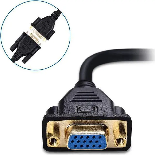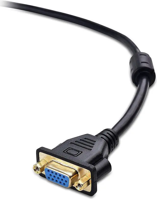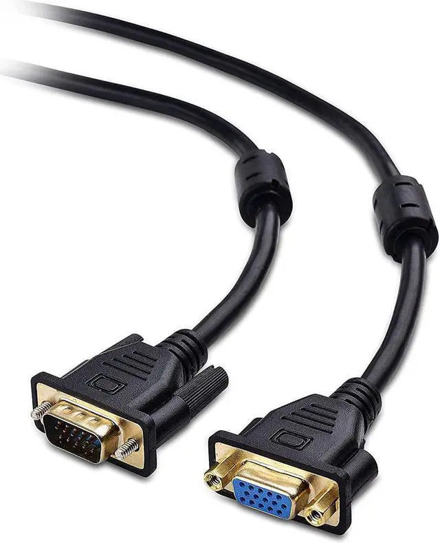 VGA video extension cable extends the length of an existing HD15 VGA cord; Connect to a monitor across the room or attach to an existing male to male VGA cable in a hard-to-reach location behind a desk with this VGA monitor cord extender; Extend a KVM switch VGA monitor cable with this convenient computer extension cord for VGAMonitor cable extension cord supports video resolutions up to full HD 1080p including 800x600 (SVGA) 1024x768 (XGA) 1600x1200 (UXGA) and 1920x1200 (WUXGA); Connect to an LED-lit and LCD HD monitor with this SVGA extension cableIntegrated ferrite cores on this male to female VGA cable minimize crosstalk suppress noise and protect against radio frequency interference (RFI) and electromagnetic interference (EMI) Hex nuts on the VGA male to female extension cable mate with the thumb screws on the existing VGA cable to provide a secure connection; Flexible VGA extender cord extends an RGB cord from a monitor or projector in secondsSuperior construction of VGA monitor cable for extension includes gold-plated connectors with molded strain relief easy-grip treads finger-tightened screws on the male end and female hex nuts on the VGA monitor cable end; Bare copper conductors foil & braid shielding and integrated dual ferrite cores provide a reliable signal transmission on this VGA video cord