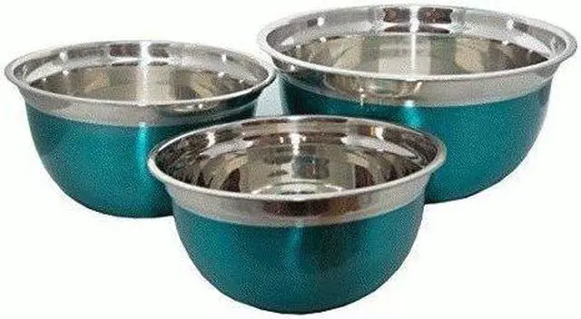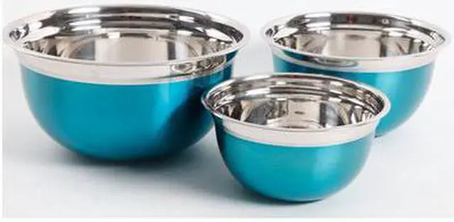The Rosamond 3-Piece mixing bowl set provides a size for virtually every kitchen need. The stainless steel finish is both attractive and long-lasting. The sizes are 5 qt, 3.5 qt and 1.5 qt . - metallic turquoise finish - the bowls nest for easy storage - dishwasher safe