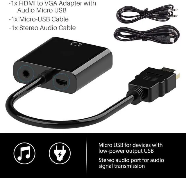 Jansicotek HDMI to VGA Adapter (HDMI to VGA Converter) with 3.5mm Audio Port & Micro USB Charging Port - For Computer, Desktop, Laptop, PC, Monitor, Projector, HDTV, Chromebook, Raspberry Pi - Black