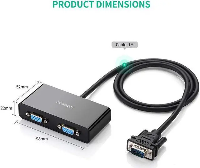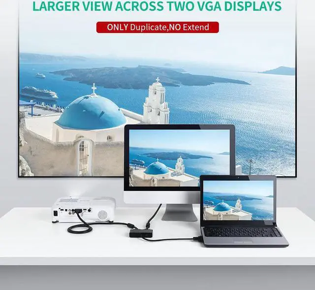 How it Works: This VGA splitter enables you to connect a VGA input device(laptop, PC, set-top box, blue-ray, etc. ) to two VGA output display screen devices. And it only can deliver the same image. (TVs, displays, projectors, etc. ), supports 82ft long-distance transmission.