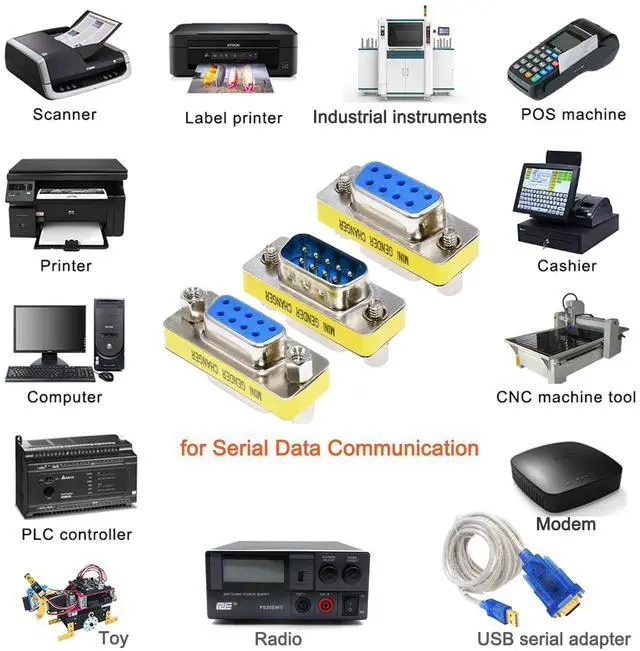 DB-9 gender changer is compatible with devices that requires COM port connection: controlling computer, digital machine, PDA, commercial cashier, thermal label printer, rs232 splitter, serial port card, server, marine vessels, network device, telescope, radio, old Cisco router, transceiver, industrial automotive instruments,etc.