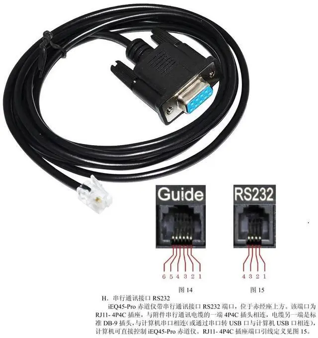 The iEQ45-Pro equatorial mount has a serial communication interface RS232 port, located above the right ascension mount. This port is an RJ11-4P4C socket, which is connected to the 4P4C plug at one end of the serial communication cable, and the other end of the cable is a standard DB9 plug, which is connected to the computer serial port (Or connect to the computer USB port through the serial port to the USB port), the computer can directly control the iEQ45-Pro equatorial mount.