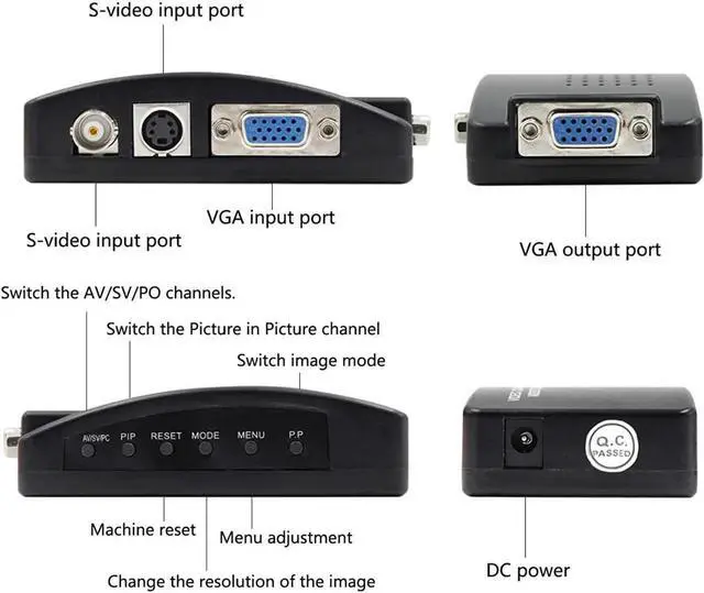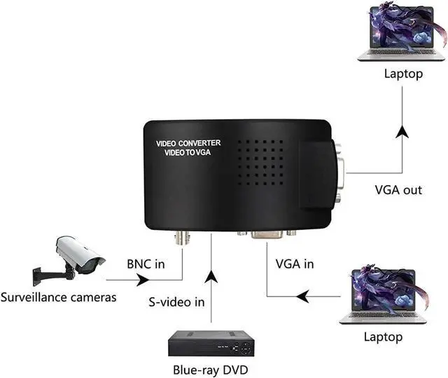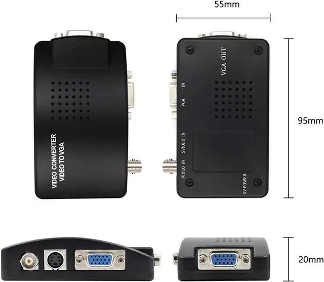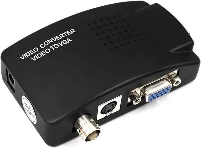 • vga. 4 pin s-video. bnc in. vga out. convert vga/s-video/bnc to vga. the video converters supports output from 800