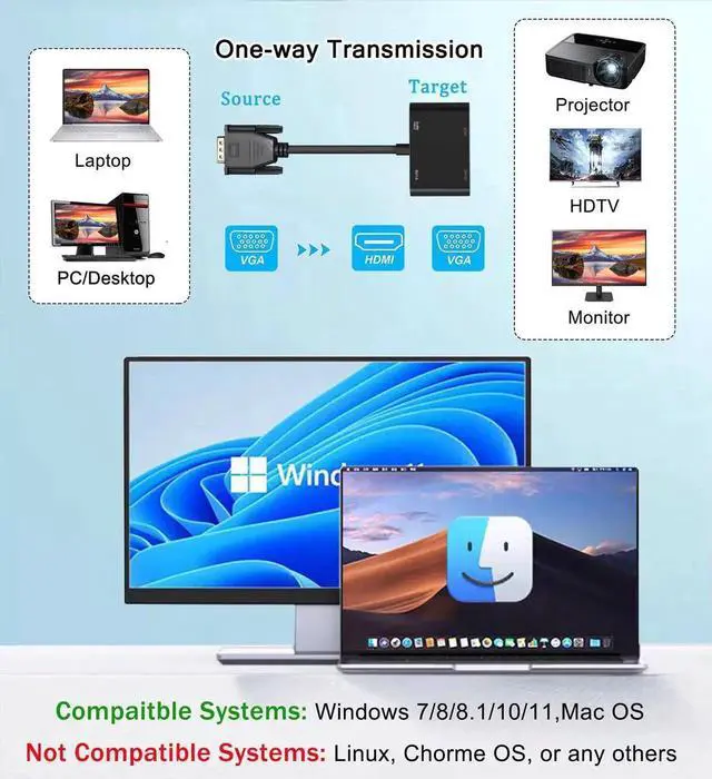 VGA to HDMI Adapter 2 in 1, VGA to HDMI+VGA Adapter Splitter for dual monitors, 2K@60HZ Full HD Display Video Converter for PC/Laptop to Big Screen(Monitor/HDTV/Projector), Comatible with Mac OS, Windows, Linux