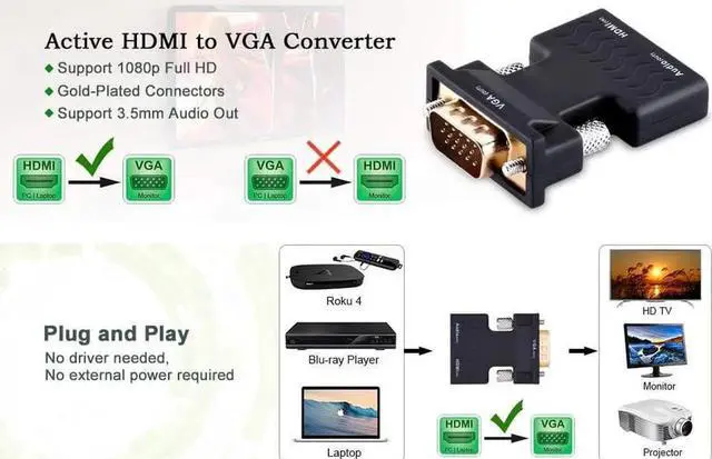 Simply connect the HDMI female end of the adapter into an HDMI connector of notebook or desktop PC by extra HDMI cable and the female end of the adapter to your VGA cable from the display. It converts HDMI digital signal to VGA analog signal and supports full-size high-definition resolution of 720p or 1080p.