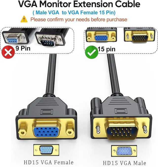 Note: It doesn't support 9-pin VGA devices)Pure Data Stream TransmissionFoil & braid shielding and integrated dual ferrite cores on the VGA wire minimize protect against electromagnetic interference (EMI) and radio frequency interference (RFI) and crosstalk suppress noiseExtremely Wide CompatibleHigh performance VGA cable connects a VGA (Video Graphic Array) equipped computer to a monitor or projector with 15-pin VGA port (also known as RGB DB-15 DE-15 HD-15 HDB-15 or D-sub 15) for video editing gaming or video projection. Ideal for classrooms conference rooms meeting rooms House of worship and many more (NOTE: VGA cable does not have audio functionality)Advantage of Extension VGAVGA video extension cable extends the length of an existing HD15 VGA cord; Connect to a monitor across the room or attach to an existing male to male VGA cable in a hard-to-reach location behind a desk with this VGA monitor cord extender; Extend a KVM switch VGA monitor cable with this convenient computer extension cord for VGA?? Important Note1. This is vga male to female cable not vga male to male cable. 2. The screws on the VGA female head are non removable. 3. This is VGA 15 PIN Extension cable and it is not 9 Pin VGA Cable so It doesn't support 9-pin VGA devices?? 4. Please carefully review the video before use?? Lifetime WarrantyWe offer quality products for a very reasonable price that has a lifetime warranty. Please do not hesitate to contact us if you have any questions and we will resolve them promptly.
