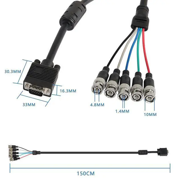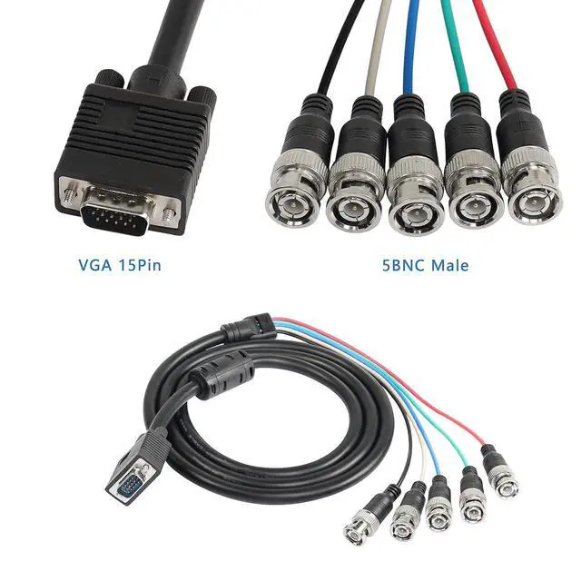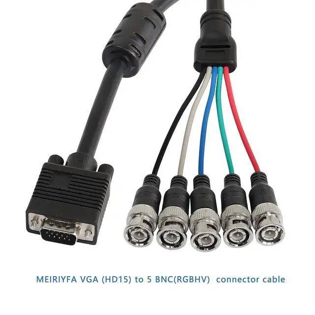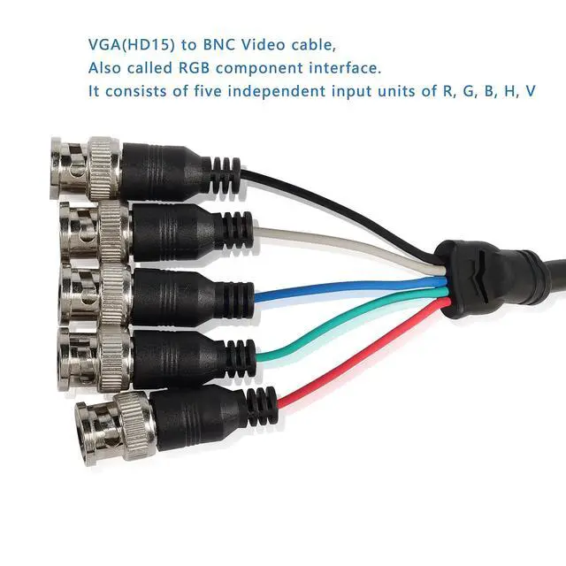 VGA (HD15) to BNC Video cable also called RGB component interface. It consists of five independent input units of R G B H V. 5 Internal Coax Lines Supports Highest Resolutions for most Monitors. The BNC interface is a separate display signal interface that is an interface that uses red green blue and horizontal and vertical scanning frequencies to separately input the display and is used by some professional monitors. Theoretically the signal quality is better and the external interference is less. This cable is great for interconnecting video devices as well as for use on testing equipment.