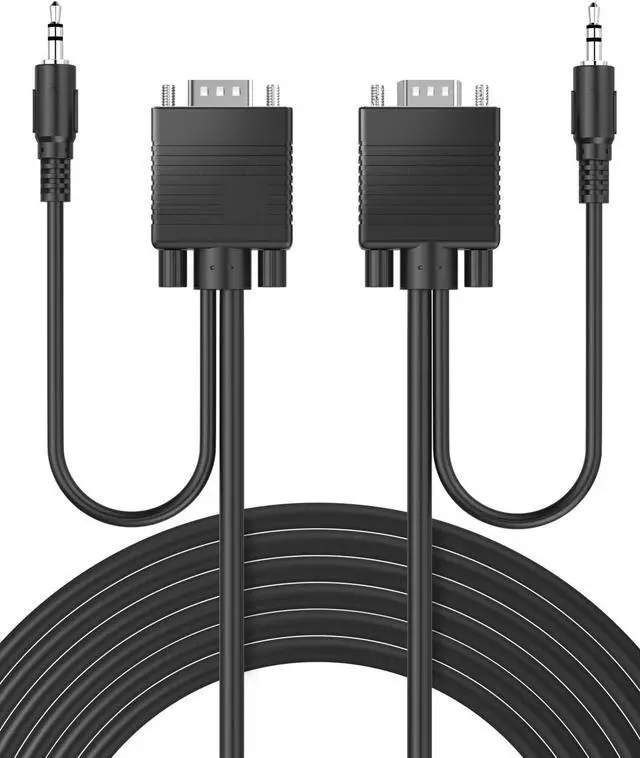 VGA male to VGA male monitor cable to connect desktop and laptop computers to monitors TVs and projectorsHigh resolutions up to WUXGA (1920x1200) and Full HD are supported 3.5 mm TRS audio cable attached to provide audio - VGA alone does not support audioPlug-and-play design no downloads drivers or installations needed; Thumbscrews help secure the VGA cable into the connected devices